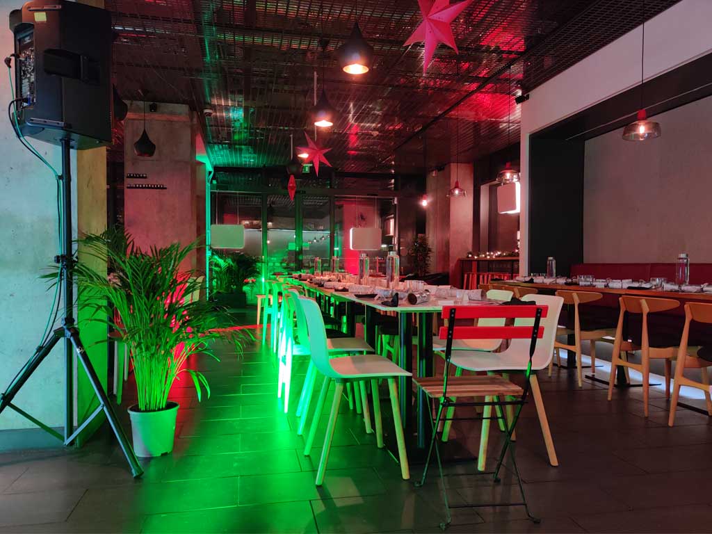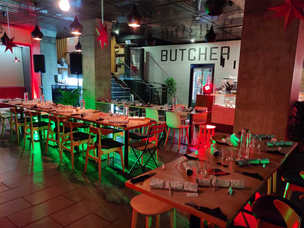 The party was for our regular client UCLH (see other events here). We have been providing this fun bunch their Christmas parties every year for the past five years. On this occasion, they had booked a small cafe burger joint but the venue needed some oomph with a disco uplighting providing a atmosphere.
