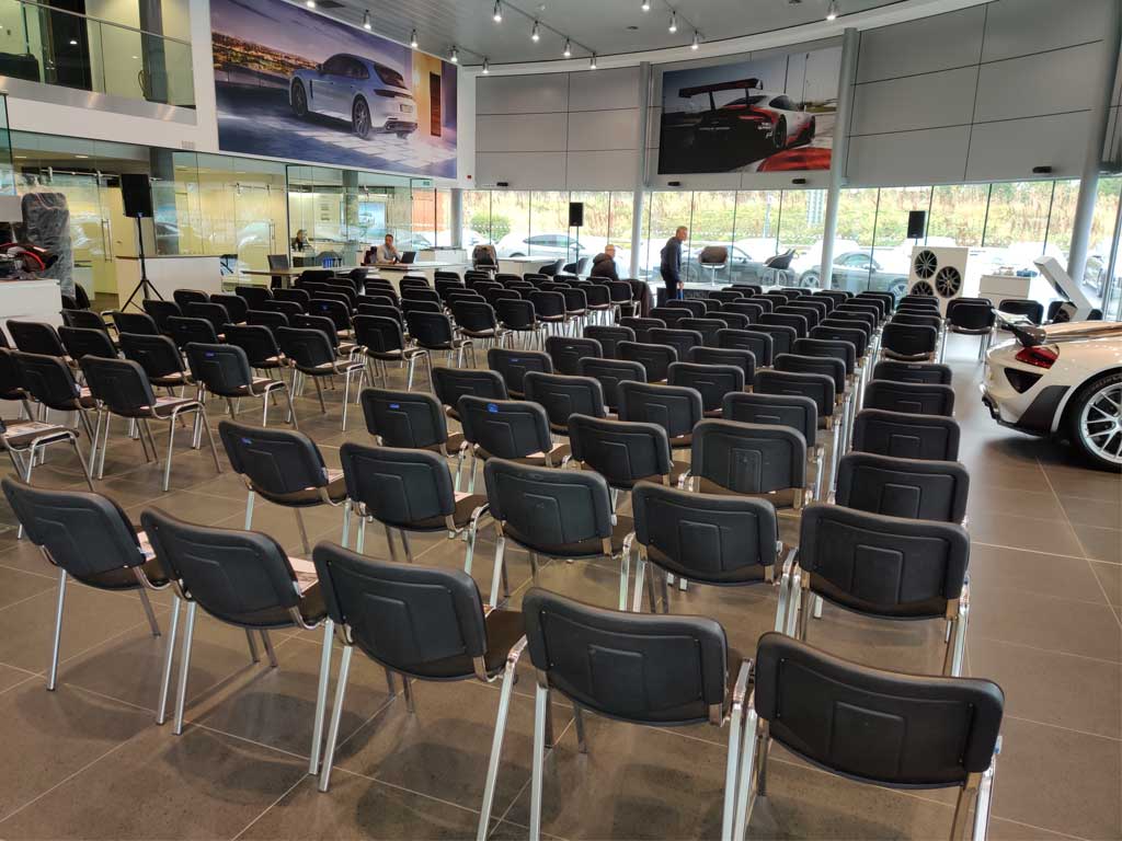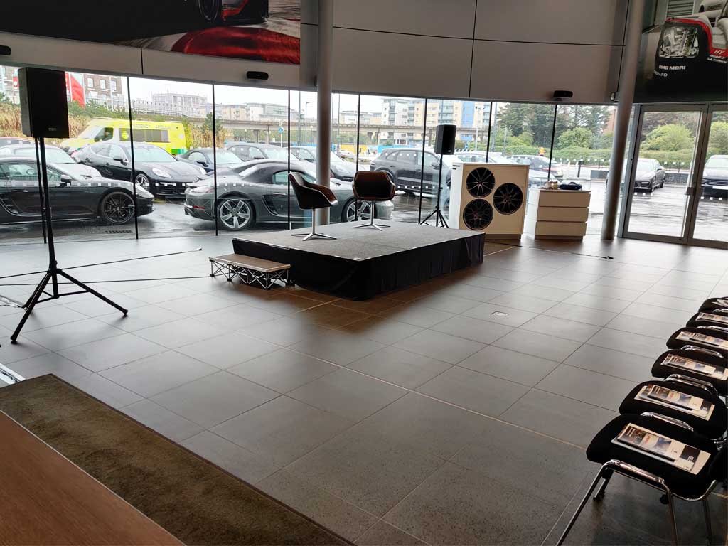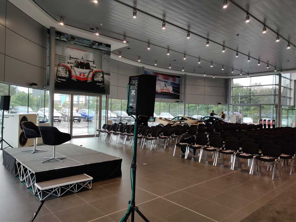 We have been regular suppliers for Porsche events since early 2019. We understand the specific sound limitations and acoustics of car showrooms among many other types of venues. This type of PA system for speeches and panel guest questions, along with background music, requires the correct configurations of bass and treble to avoid echoing sounds and to ensure proper sound dispersion throughout these large venue spaces.